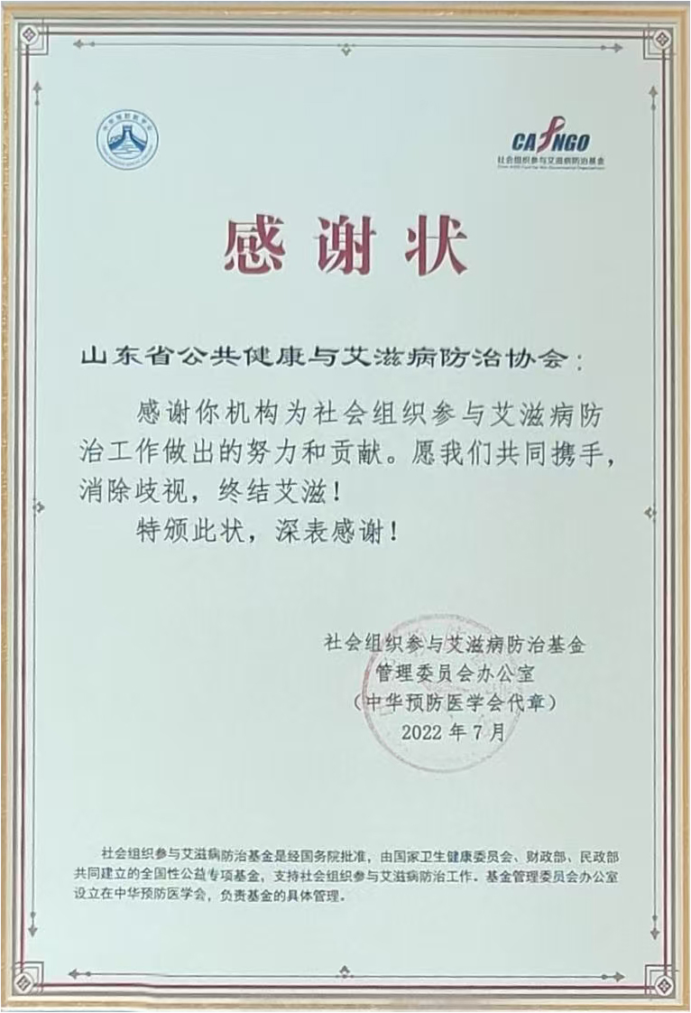 山东省公共健康与艾滋病防治协会原山东省艾滋病防治协会,以下简称协会)成立于2008年7月,是一家集学术性、公益性、非营利性的省级社会组织。协会的登记管理单位是山东省民政厅,业务主管单位是山东省卫生健康委员会。2021年12月,经省卫生健康委员会批准,报请省民政厅同意,由“山东省艾滋病防治协会”正式更名为“山东省公共健康与艾滋病防治协会”。协会主要业务范围包括宣传和普及公共健康知识,开展公共健康学术交流、专题调研、科学研究和继续医学教育等工作,开展公共健康与艾滋病防治政策、策略等相关论证和咨询服务等,动员社会力量开展形式多样的公益活动,开展艾滋病防治工作,承接政府有关部门职能转移和委托的工作任务。2022年在省级社会组织等级评估中获评5A级。
