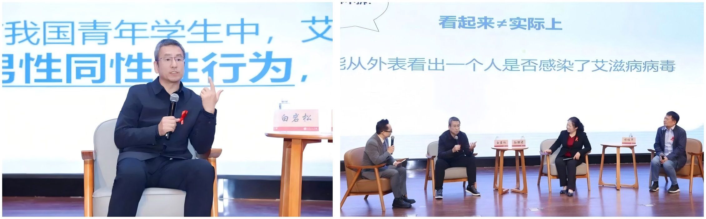 访谈环节,红丝带健康大使、央视资深媒体人白岩松,首都医科大学附属北京佑安医院性病艾滋病门诊主任孙丽君和山东省公共健康与艾滋病防治协会副会长、主任医师傅继华围绕艾滋病离大学生远不远、新发感染传播途径哪种所占比例最高、怎么保护自己避免艾滋病的侵害等话题与参加同学们展开互动,通过话题解答旨在科学普及艾防知识、将科学认识看待艾滋病的种子埋到更多同学心中。并为现场学生进行答疑解惑,引导学生树立正确的婚恋观,做自己健康第一责任人。针对“作为志愿者如何更高效地宣传防艾知识”的提问,白岩松老师强调,防艾宣传不应止于单次现场活动,而要着力打造“乘法效应”的宣传模式。他鼓励青年学子主动成为家庭的“健康家长”,以自身行动带动身边人共同学习防艾知识,切实扩大宣传的广度与深度。